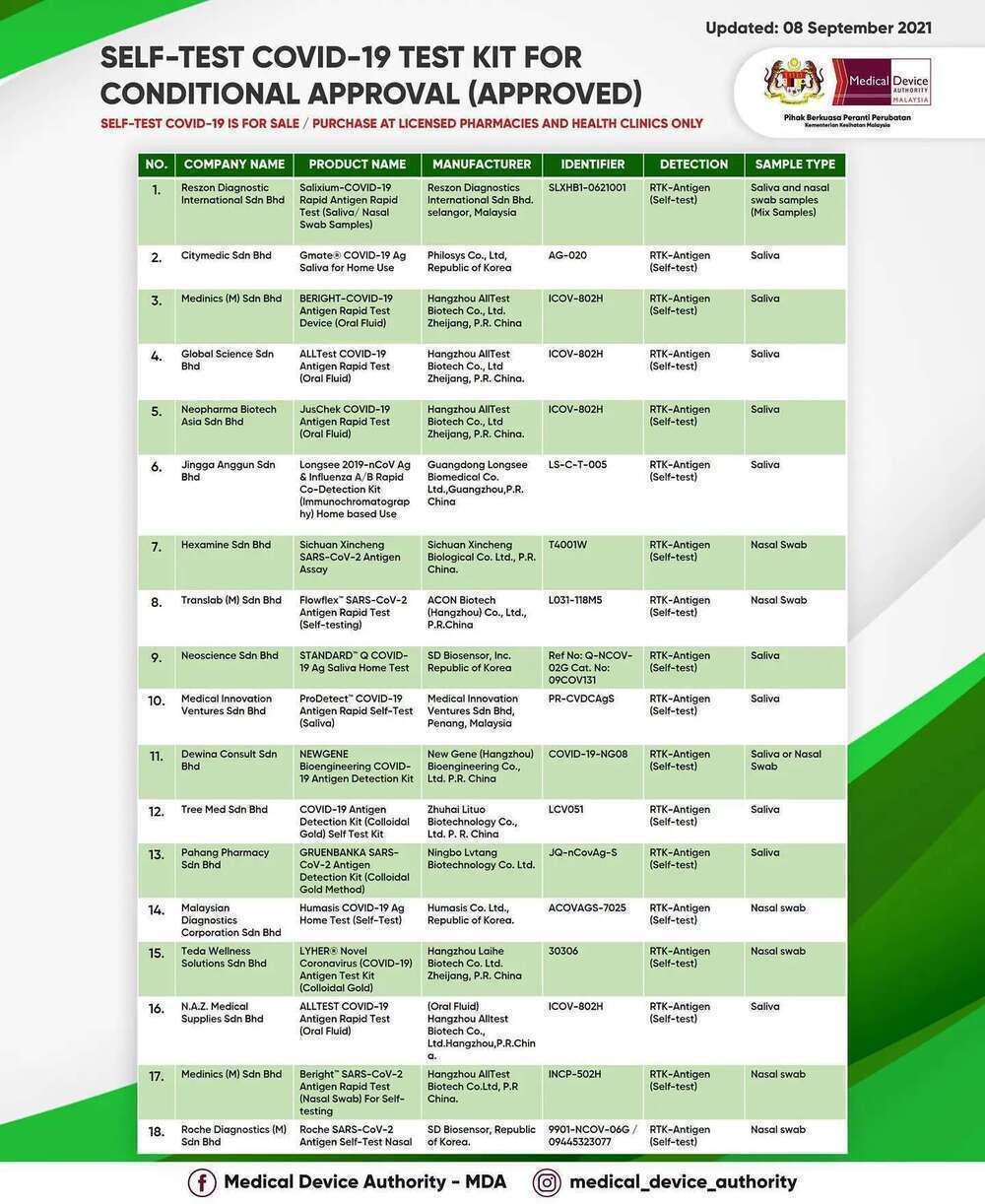 Self-Test Covid-19 Test Kit For Conditional Approval (Approved) Updated on 8 September 2021