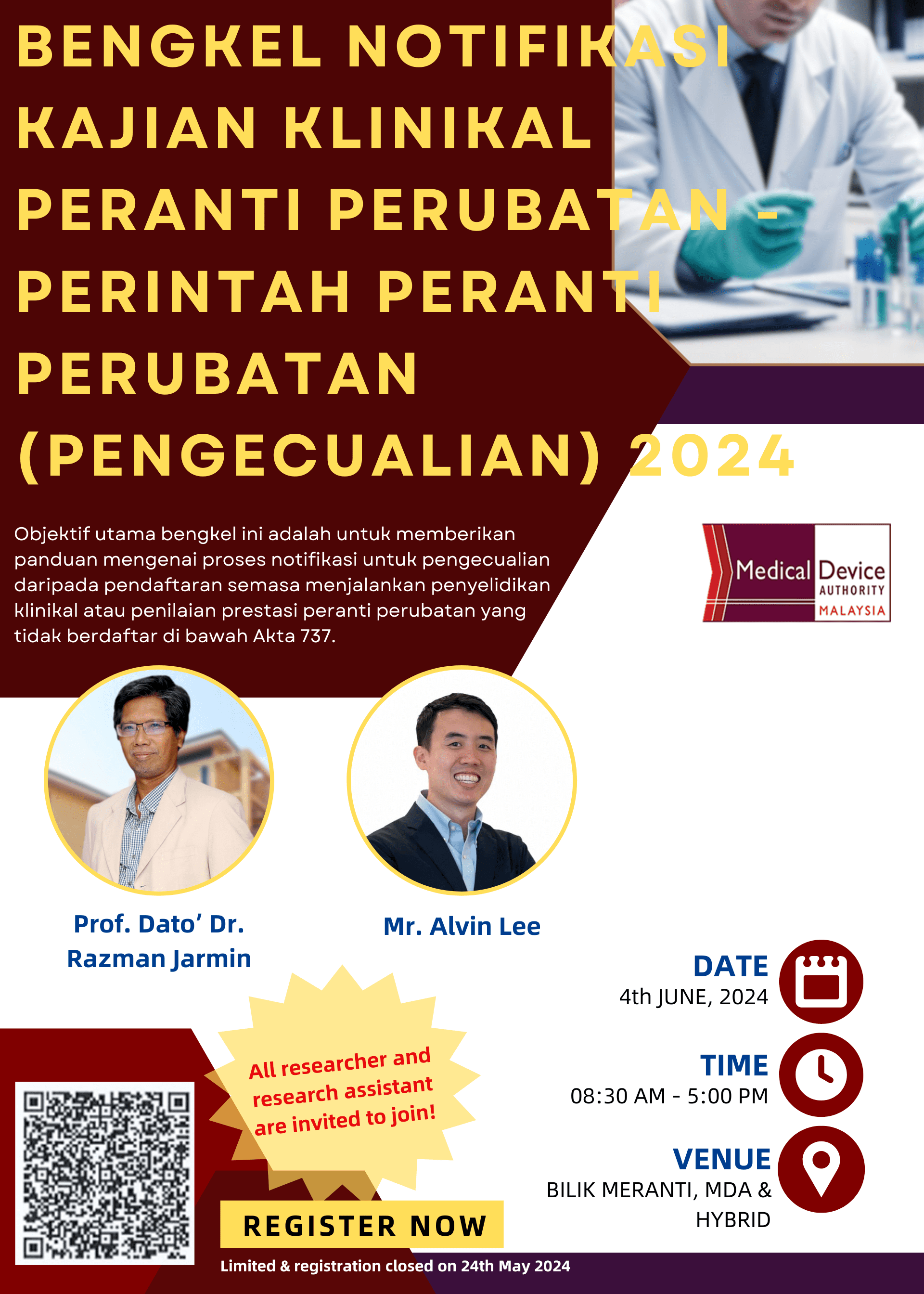 We cordially invite all professionals involved in clinical investigations and medical device studies to attend the upcoming programme. This workshop is designed to provide essential information and guidance on conducting clinical investigations and device studies in compliance with the Medical Device Act 737. To secure your spot, please register quickly using the attached QR code. Space is limited, so early registration is encouraged.